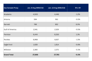 The US natural gas pipeline sample, a proxy for change in oil production, decreased 0.3% W-o-W across all liquids-focused basins.