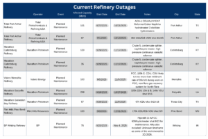 As of Sept. 29, there is currently ~1,102 Mb/d of refining capacity offline for planned maintenance. The Flint Hills Pine Bend refinery accounts for 150 Mb/d of the offline capacity due to planned maintenance lasting until Dec. 31.