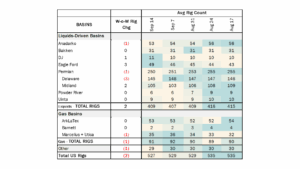 - The total US rig count decreased during the week of Sept. 14 to 527. Liquids-driven basins increased 2 rigs W-o-W from 407 to 409.
