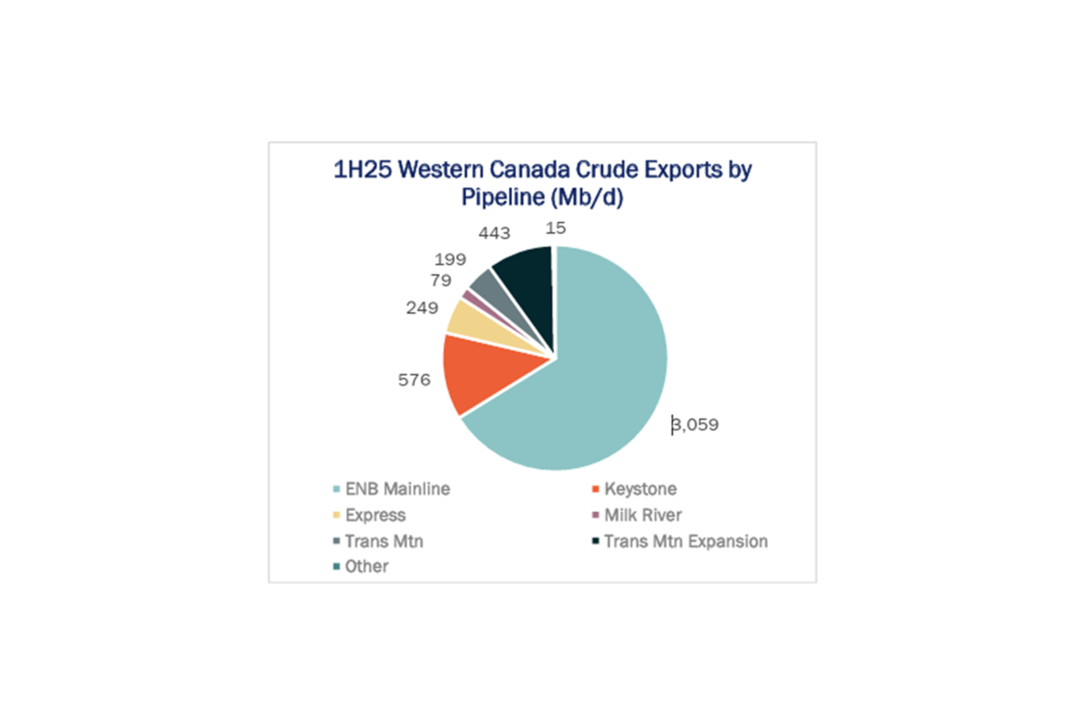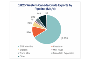 The MLO1 project is a logical next step for Enbridge as Canadian crude volumes continue to approach pipeline limits. According to ENB’s latest earnings call, the Mainline system was apportioned throughout 3Q25 and operated at roughly 95% utilization during the first half of the year, accounting for an average of 66% of all Canadian crude exported by pipeline (see figure). The Mainline is the leading export route for Canadian crude, supported by steady US refinery demand for heavy sour barrels.