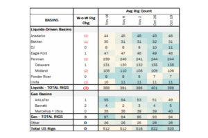 The total US rig count remained unchanged during the week of Nov. 16 at 512 rigs. Liquids-driven basins lost 3 rigs W-o-W from 391 to 388.
