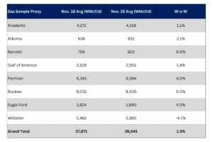 Supply & Demand: The US natural gas pipeline sample, a proxy for change in oil production, increased 1.3% W-o-W across all liquids-focused basins.