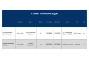 As of Dec. 1, there was ~250 Mb/d of refining capacity offline for planned maintenance, as refinery outages reach a low. These outages occurred at ExxonMobil’s Baton Rouge and Baytown refineries.