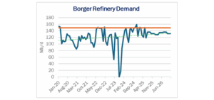 ET owns 55% of the Price River Terminal, located southeast of Salt Lake City on the western edge of the Uinta. Under the agreement, FourPoint will take 50 Mb/d of capacity in the expanded terminal. The Denver-based producer has steadily run 1-2 rigs in the Uinta since 4Q24, according to the “Producer to System Analysis” dashboard in Energy Data Studio.