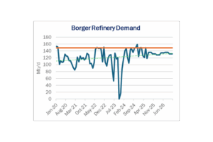 Located northeast of St. Louis, Wood River is PSX’s largest US refinery and a key Midwest asset. It is partially supplied by Enbridge’s (ENB) Express-Platte system, which is set to expand by 30 Mb/d in 2026. According to East Daley Analytics’ Crude Hub Model, the Platte line has run 74% utilized in 2025, with throughput set to rise to 89% post-expansion.