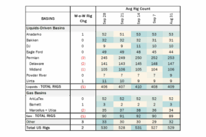 The total US rig count increased during the week of Sept. 28 to 530. Liquids-driven basins decreased 1 rig W-o-W from 407 to 406.