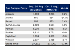The US natural gas pipeline sample, a proxy for change in oil production, decreased 1.3% W-o-W across all liquids-focused basins.