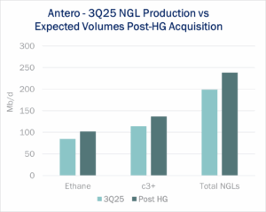The deal for Parkersburg, WV-based HG Energy adds ~850 MMcfe/d of 2026 production, and the Utica sale removes ~150 MMcfe/d, resulting in a net 700 MMcfe/d production gain to AR. On net, the two deals yield a 20% uplift to Antero’s 2025 production guidance of 3.4-3.45 Bcfe/d.