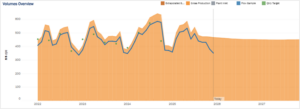 Details on the private HG Energy system are available in the “G&P System Analysis” dashboard in East Daley Analytics’ Energy Data Studio. HG Energy is the sole producer on the asset and ran as many as 2-3 rigs in early 2024, though drilling has declined to under 1 rig in 2025. Dry gas volumes peaked near 640 MMcf/d in 3Q24 and have generally trended lower since, declining to under 500 MMcf/d in 2H25 (see figure above from Energy Data Studio).