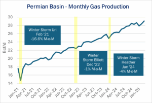 Texas adopted weatherization rules after Winter Storm Uri, which should reduce the risk of prolonged, system-wide outages. Critical gas infrastructure, including wells, processing plants and pipelines tied to the electricity supply chain, is now required to maintain operations during weather emergencies or face significant penalties, according to regulations set by the Texas Railroad Commission. Even so, weatherization does not eliminate freeze risk. Localized equipment failures, inlet pressure losses and reduced recovery rates have continued to surface during recent storms.