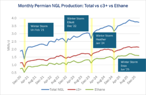 Recent extreme winter events show this pattern clearly. In February 2021, Permian natural gas production fell 16.6% M-o-M as a result of Winter Storm Uri (see figure above). NGL production has also taken major hits. During Winter Storm Enzo in January 2025, US ethane supply fell 6–7.5% M-o-M, while propane supply declined 4–6%. Permian freeze-offs accounted for most of the losses (see figure below).