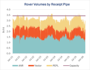 Rover, which will add a new meter as part of the expansion, regularly runs at over 90% utilization (see figure at right). This leaves little capacity available to transport additional volumes on an expanded Crossroads without Rover itself expanding.