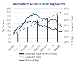 Despite these factors, operators are steadily investing more in the Delaware relative to the Midland. Rig counts in the Delaware accounted for nearly 58% of total Permian Basin activity in 2025, up from a 51% share of rigs in 2021 (see figure). Ten years ago, the Delaware represented only 45% of Permian rigs, according to historical rig data in East Daley’s Energy Data Studio.