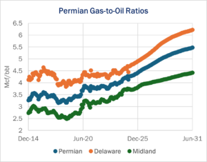 The most important consequence is the divergence in the production outlook between crude oil and natural gas and NGLs. Gas-to-oil ratios (GOR) are rising in the Permian Basin for several reasons, and the migration to the Delaware is a primary contributor. Since Delaware wells produce more gas than those in the Midland (see figure above), methane is becoming a larger share of overall Permian output as more wells are drilled there. While East Daley forecasts relatively flat Permian crude oil production through 2030, we expect robust growth ahead in gas and NGLs.