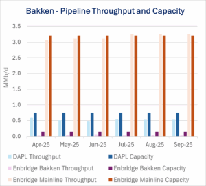 Though information is limited, ENB’s assets offer a clear pathway for how Canadian barrels could be routed onto DAPL. The Enbridge Bakken line currently moves light-sweet Bakken volumes north from Minot County, ND to Cromer in Manitoba, where it links into the Mainline. The pipeline is designed to carry ~150 Mb/d of crude but has been notably underused, averaging ~37 Mb/d over the last six months, according to East Daley’s Crude Hub Model.