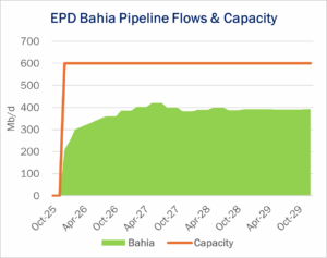 Enterprise Products’ (EPD) Bahia NGL pipeline is scheduled to enter service in December 2025, adding a major new artery from the Delaware and Midland basins to Mont Belvieu. The 550-mile system brings 600 Mb/d of Y-grade capacity, replacing legacy flows on Seminole Pipeline and increasing net Permian NGL takeaway by ~450 Mb/d.