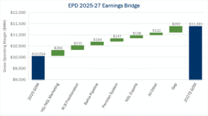 For a company the size of Enterprise, it’s an ambitious target. Can EPD really expect to grow EBITDA by 13.3% from 2025 to 2027? Based on East Daley Analytics’ latest EPD Financial Blueprint model, we believe the growth trajectory is achievable. The earnings bridge in the figure on page 1 shows the path EDA expects EPD to follow to achieve the growth target.