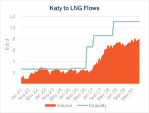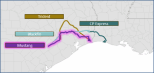 Less than 3 Bcf/d of pipeline capacity currently runs between Katy and the Gillis hub in Louisiana, limiting the amount of Texas gas supply that can reach the highest concentration of LNG demand growth. However, Mustang Express is the latest of several pipes in development to expand that corridor and build a seamless route from the Permian to Gillis-based LNG demand.
