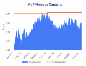 MVP is currently flowing around 1.5 Bcf/d from West Virginia’s northern Marcellus/Utica production area to Station 165 on the Transcontinental pipeline (Transco) in southern Virginia. MVP was placed into service in the summer of 2024 following years of legal battles. Flows on the pipeline have been seasonal through the first year and a half of operations, hitting peak capacity in January and February ’25 but decreasing during the spring shoulder season (see figure).