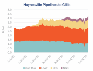 The chart shows all four major Haynesville egress pipes to Gillis. Williams’ (WMB) Louisiana Energy Gateway (LEG) has ramped quickly to over 0.85 Bcf/d on average in September, and DT Midstream’s (DTM) LEAP is running nearly full at 1.9 Bcf/d capacity. DTM expects to put the Phase 4 expansion (+0.2 Bcf/d) into service ahead of schedule in early 2026. Gulf Run’s Zone 2 line is running under capacity and has actually seen a slight reduction in flows as volumes begin to fill new pipes. However, we expect that volumes will rapidly increase once Golden Pass LNG turns online; Golden Pass holds 1.1 Bcf/d of capacity on Gulf Run.