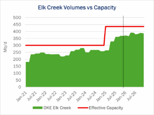 Filings show Elk Creek volumes jumped nearly 100 Mb/d through September 2025, from a combination of pipeline diversions and increased output from Bakken gas processing plants.