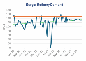 Located northeast of St. Louis, Wood River is PSX’s largest US refinery and a key Midwest asset. It is partially supplied by Enbridge’s (ENB) Express-Platte system, which is set to expand by 30 Mb/d in 2026. According to East Daley Analytics’ Crude Hub Model, the Platte line has run 74% utilized in 2025, with throughput set to rise to 89% post-expansion. MPLX’s Ozark Pipeline out of Cushing also supplies Wood River. The Ozark line has averaged high-90% throughput with a capacity of 360 Mb/d. Wood River produces gasoline, diesel, aviation fuels, petrochemical feedstocks, asphalt and petroleum coke.