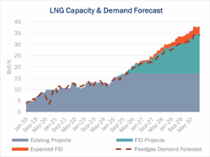 In total, East Daley Analytics forecasts 20.8 Bcf/d of incremental LNG feedgas capacity will be online by the end of the decade, on top of the 17.2 Bcf/d of current capacity. Our current estimate in the Macro Supply & Demand Report for total LNG feedgas demand is 34.2 Bcf/d by YE30, assuming 90% average utilization across all facilities (see figure above).