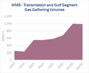 We also expect big gains in the Transmission and Gulf segment as Shell’s Great White well ramps in the Mississippi Canyon area of the deepwater Gulf (see figure). Williams will also get a boost from the Salamanca well, which produced first oil Sept. 29. That well in the Keathley Canyon area will flow associated gas into WMB’s Discovery Pipeline. The Salamanca well brings a modest 3Q contribution but will keep volumes elevated in 4Q25.