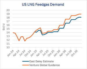EDA has observed ~1.6 Bcf/d of pipeline flows to the facility in March and an average of 1.18 Bcf/d in 1Q25. Venture Global reported that 24 cargoes have been contracted so far in 1Q25, and 4-5 more are expected in March. However, VG guided to a potential 92 cargoes in 4Q25, which would indicate that it expects all trains to be online by the end of 2025, equating to over 3 Bcf/d of demand.