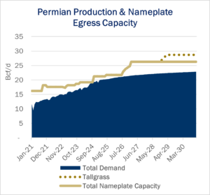 The new pipeline would add to an overbuild by the end of the decade, according to East Daley Analytics’ Permian Basin S&D Model. WhiteWater Midstream is building the 2.5 Bcf/d Blackcomb Pipeline, and Energy Transfer (ET) has taken a final investment decision on the 2.2 Bcf/d Hugh Brinson project. Taken together, we estimate the Permian will have ~6 Bcf/d of excess egress capacity in 2029 and 2030 with the Tallgrass pipe (see figure).