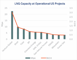 The figure above shows East Daley Analytics’ estimates for capacity by counterparty at US LNG projects currently in operation. These estimates include long-term sales contracts for customers, as well as spare capacity controlled by project sponsors.