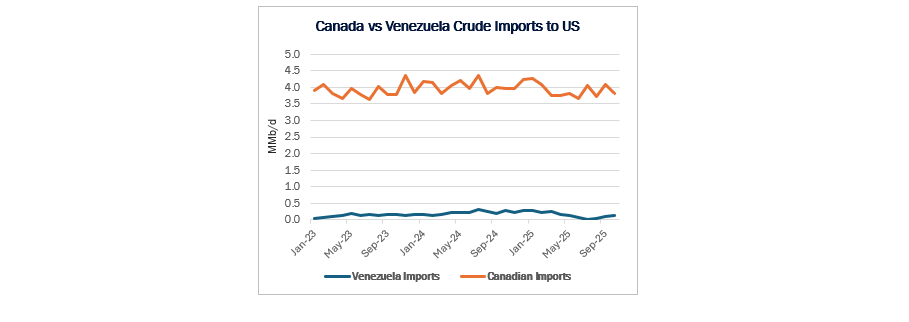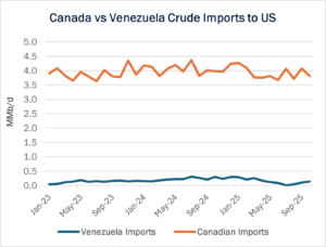 Venezuelan crude is a close substitute for the heavy barrels mined in the Canadian oil sands. If Venezuelan barrels are brought to market, they would create more competition for capacity at the US Gulf Coast refiners designed to process these heavy barrels.