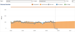The PRB assets include the Jackalope gathering system and the Bucking Horse I/II cryogenic plants in Converse County, WY (see map from ET). Jackalope includes ~180 miles of gathering line and primarily serves Continental Resources, Occidental Petroleum and Anschutz. The Bucking Horse plants have total processing capacity of 345 MMcf/d and deliver residue gas to Kinder Morgan’s (KMI) Wyoming Interstate system. East Daley’s “G&P System Analysis” dashboard in Energy Data Studio shows throughput of ~100 MMcf/d through the plants (see figure below).