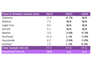 The total sample represents the flow sample and plant data accessible to EDA. The latest Q-o-Q percentage change is estimated by comparing either flow sample data Q-o-Q or plants within a basin that have continuously reported inlet volumes from the prior quarter to the current quarter. 4Q25 is expressed as Q-o-Q growth from 3Q25 and 1Q26 is expressed as Q-o-Q growth from 4Q25.