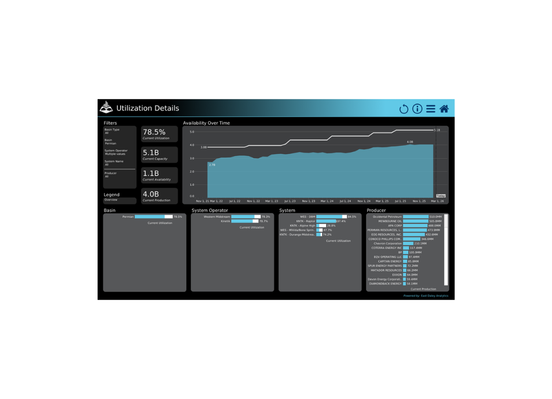 A WES-KNTK combination would have gas processing capacity of 5.1 Bcf/d in the Delaware, with backing from a diverse set of leading E&Ps. According to East Daley Analytics’ Energy Data Studio, the top producers include Occidental (OXY), Mewbourne Oil, APA Corp., EOG Resources (EOG) and ConocoPhillips (COP).