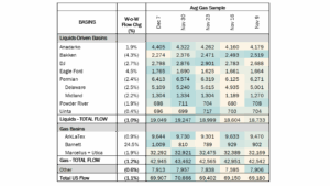 Samples in liquids-focused basins decreased 1.0% to 19.0 Bcf/d. The Permian sample declined 2.4% to 6.4 Bcf/d, while the Eagle Ford sample gained 4.5% W-o-W.