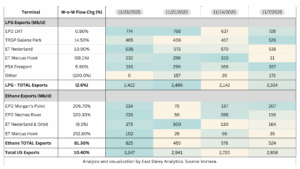 US NGL exports increased 10.4% for the week starting Nov. 28, driven by a sharp 81.3% surge in ethane exports. LPG volumes slipped 2.6% on the week. Enterprise’s Neches River ethane export terminal posted a standout week, moving 235 Mb/d, nearly double its 120 Mb/d nameplate capacity.
