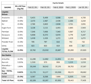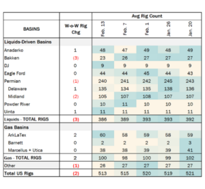 The total US rig count decreased during the week of Feb. 13 from 515 to 513. Liquids-driven basins decreased 3 rigs W-o-W, from 389 to 386.