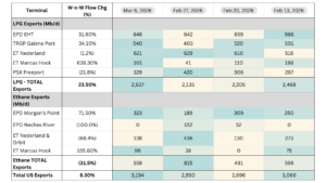 LPG exports increased 23.5% W-o-W, supported by higher volumes across most terminals, led by Marcus Hook, which surged 638% (+260 Mb/d).