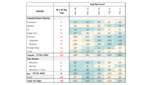 Rigs: The total US rig count decreased during the week of Feb. 28 from 525 to 521. Liquids-driven basins decreased W-o-W from 391 to 390.