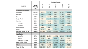 Samples in liquids basins declined 1.1% W-o-W to 22.5 Bcf/d. The Permian sample increased 2.0%, while the Anadarko sample declined 5.0%.