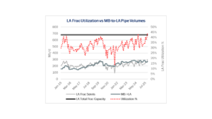 Utilization at Louisiana fracs has increased slowly but steadily since 2022, though pipeline constraints limit further gains. Using the remaining ~30 Mb/d of capacity on Cajun Sibon and LouTex, would lift utilization at the state’s fracs by only a few percentage points, still leaving about half of the regional frac capacity idle.