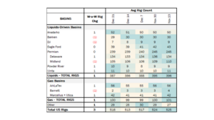 The total US rig count increased during the week of Dec. 21 from 513 to 516. Liquids-driven basins increased 1 rig W-o-W from 386 to 387.