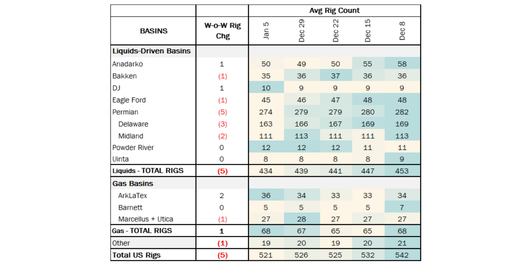 The total rig count decreased by 5 for the January 5 week, down to 521 from 526. Liquids-driven basins declined by 5 rigs W-o-W.