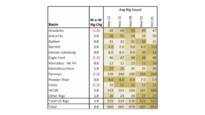 The US gained 1 rig for the week of Nov. 22, bringing the total rig count to 515. The Permian (-1), Anadarko (-1), Eagle Ford (-1) and Uinta (-1) lost rigs while the Barnett (+2), ArkLaTex (+1) and Marcellus+Utica (+1) gained rigs W-o-W.