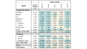 Flows in gas basins rose 2.4% as output continued to recover from impairments caused by Winter Storm Fern in late January and early February. The Marcellus+Utica sample increased 3.6% to 32.6 Bcf/d, while the Haynesville sample declined1.5% W-o-W to 10.2 Bcf/d.