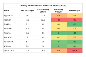 East Daley Analytics estimates that at least 17 Bcf/d of gas production was lost at the peak of last week’s powerful winter blast. Outages lingered through the end of the week from the weather event, named Winter Storm Fern by meteorologists.
