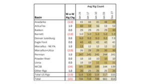 The US rig count declined by 1 for the week of Jan. 24, bringing the total rig count to 519. The Marcellus+Utica (-2), Barnett (-2) and Anadarko (-1) lost rigs while the ArkLaTex (+1), Marcellus–NE PA (+1) and Permian (+1) gained rigs W-o-W.