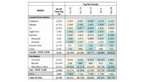 Samples in liquids-focused basins increased 0.1% to 18.4 Bcf/d. The Permian sample rose 4.75% to 6.2 Bcf/d, while the Bakken sample declined 4.7% W-o-W.
