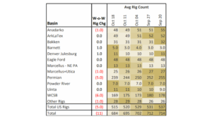 The US lost 5 rigs for the week of Oct. 18, bringing the total rig count to 515. The Permian (-5), Anadarko (-1) and Marcellus+Utica (-1) lost rigs while the Barnett (+1) and Denver-Julesburg (+1) gained rigs W-o-W.